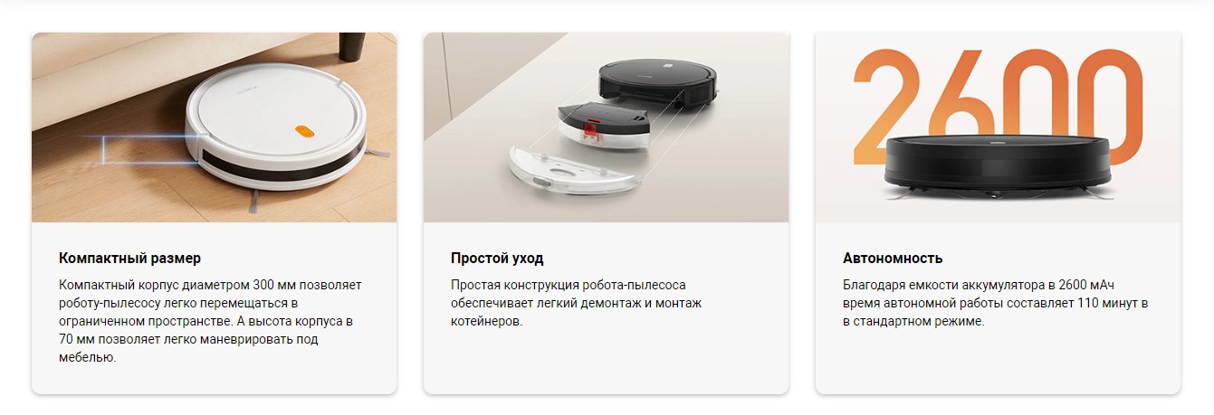 | Другие функции и возможности | голосовое управление, автоматическое возвращение на зарядную станцию |
